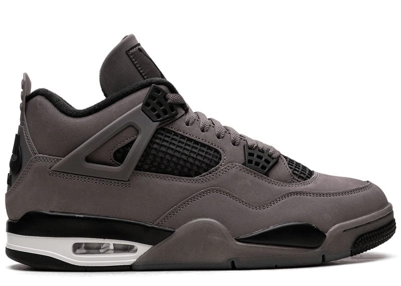 The Air Jordan 4 Retro 'Cave Stone' showcases a dark taupe hue on the smooth nubuck upper, featuring contrasting black accents on the quarter panel netting, molded eyelets, and textile collar lining. A Jumpman icon adorns the woven Flight tongue tag, while Nike Air branding graces the molded heel tab. Lightweight cushioning is provided by a white and black polyurethane midsole with visible Air-sole cushioning in the heel.